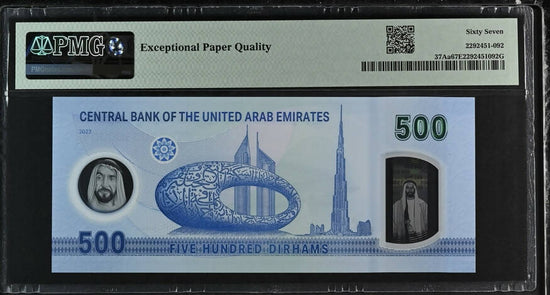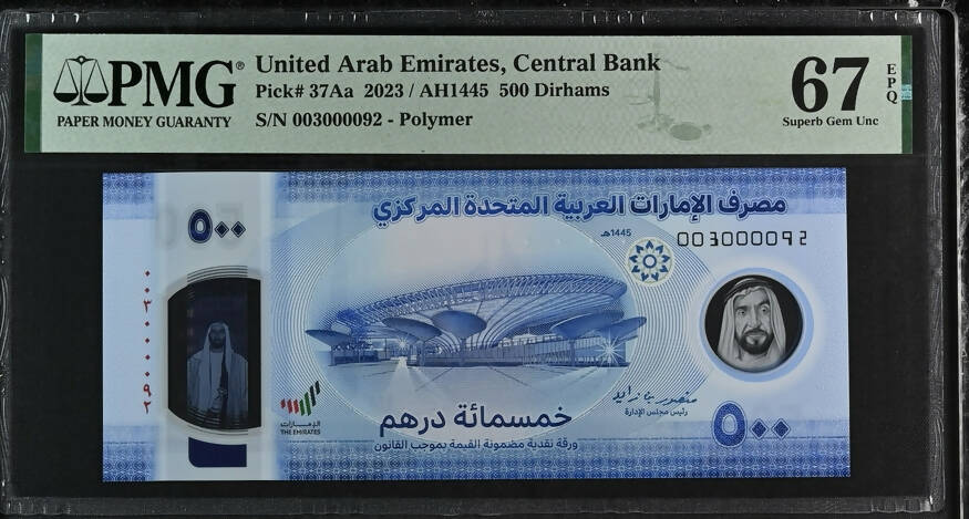 500 Dirhams, UAE, 2023, PMG 67 - LOW SERIAL NUMBER