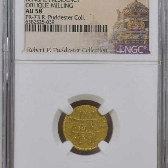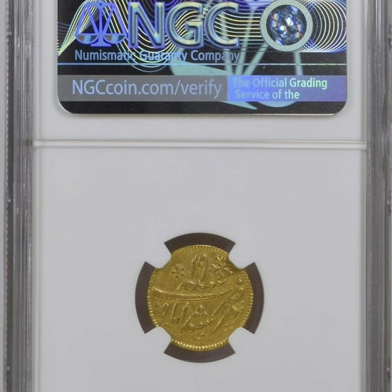 East India Company, Bengal Presidency, Murshidabad Mint: Second milled issue, gold Quarter-Mohurin the name of 'Shah AlamI(1173-1221h/1759-1806), frozen year 1204h and regnal yr 191793-1818,sikka shah alam badshah ghazi [coin of Shah Alam the victorious emperorl, rev. zarb murshidabad sanah 19 struck at Murshidabadin the19th yearl, centre group of four pellets, edge grained right