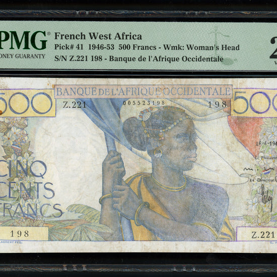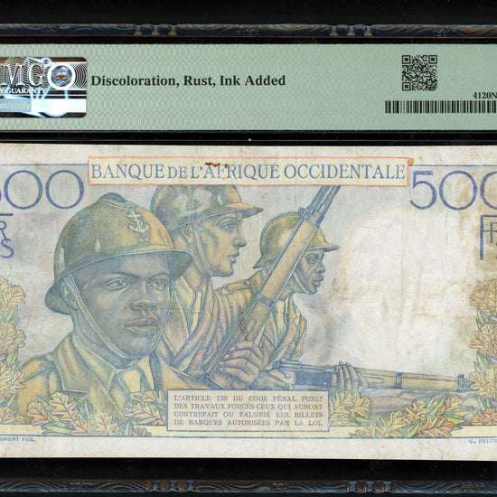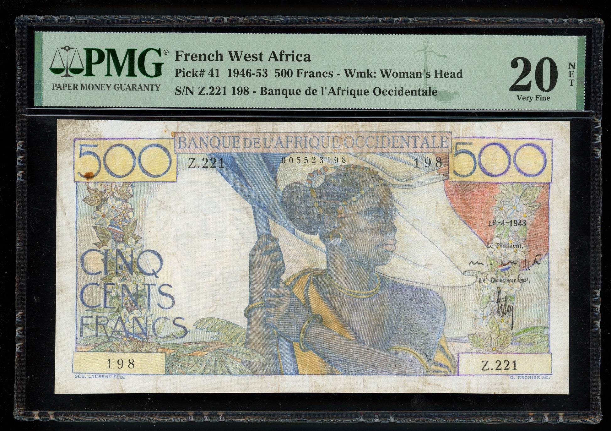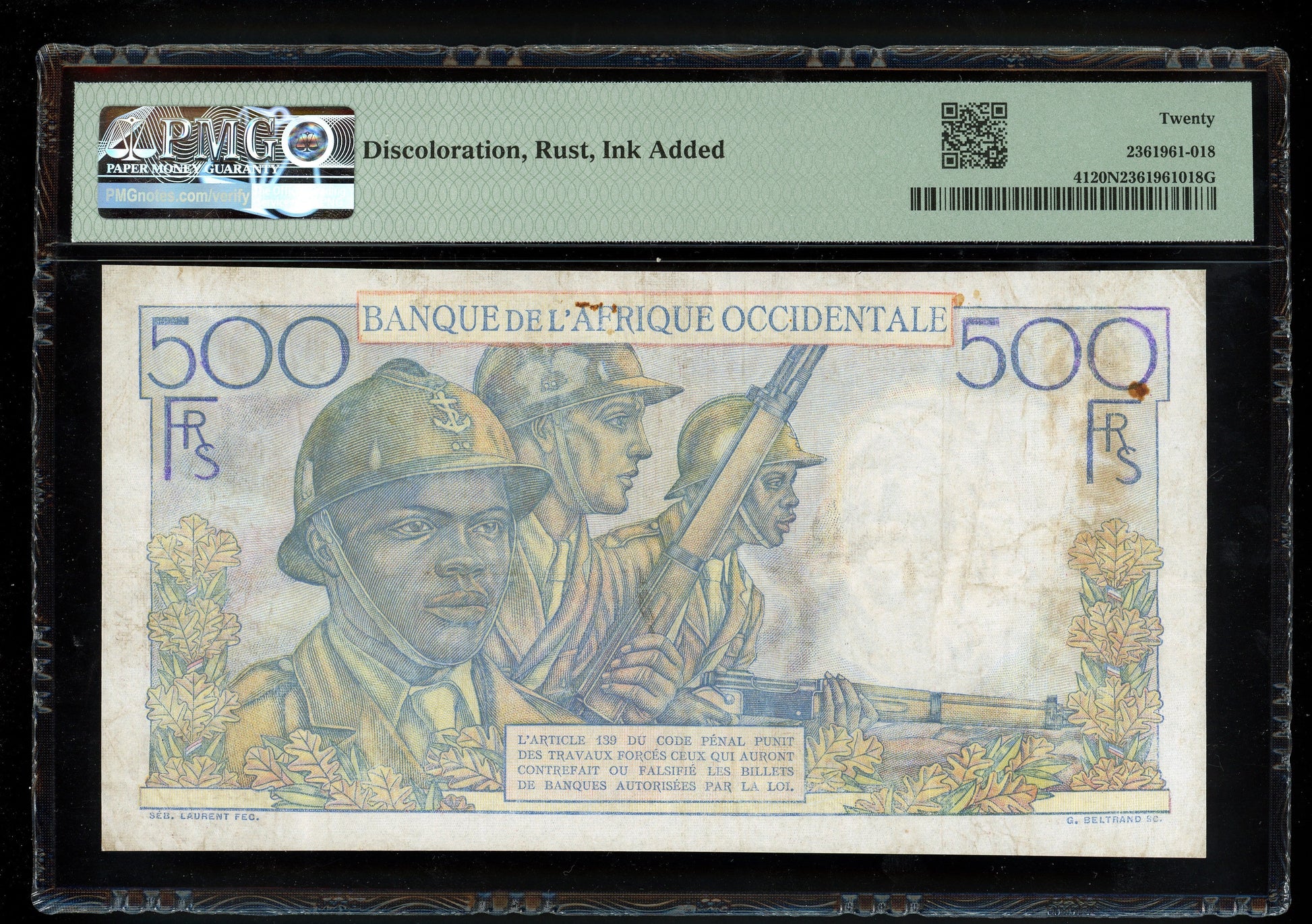 ورقة نقدية من غرب أفريقيا الفرنسية بين 1946 و1953 بفئة 500 فرنك، بتقييم PMG 20 NET. ألوانها لا تزال ظاهرة مع وجود ملاحظات في الورقة.