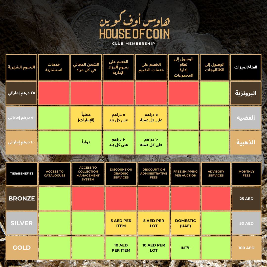 الاشتراك الأمثل لهواة جمع العملات الجادين والتجار! استمتع بأقصى الخصومات، شحن مجاني دولي عند الفوز بالمزادات، بالإضافة إلى خدمات استشارية من خبراء المقتنيات. كما يمنحك هذا الاشتراك إمكانية الوصول إلى نظام إدارة المجموعات، مما يساعدك في إدارة مجموعاتك القيّمة بكل سهولة.