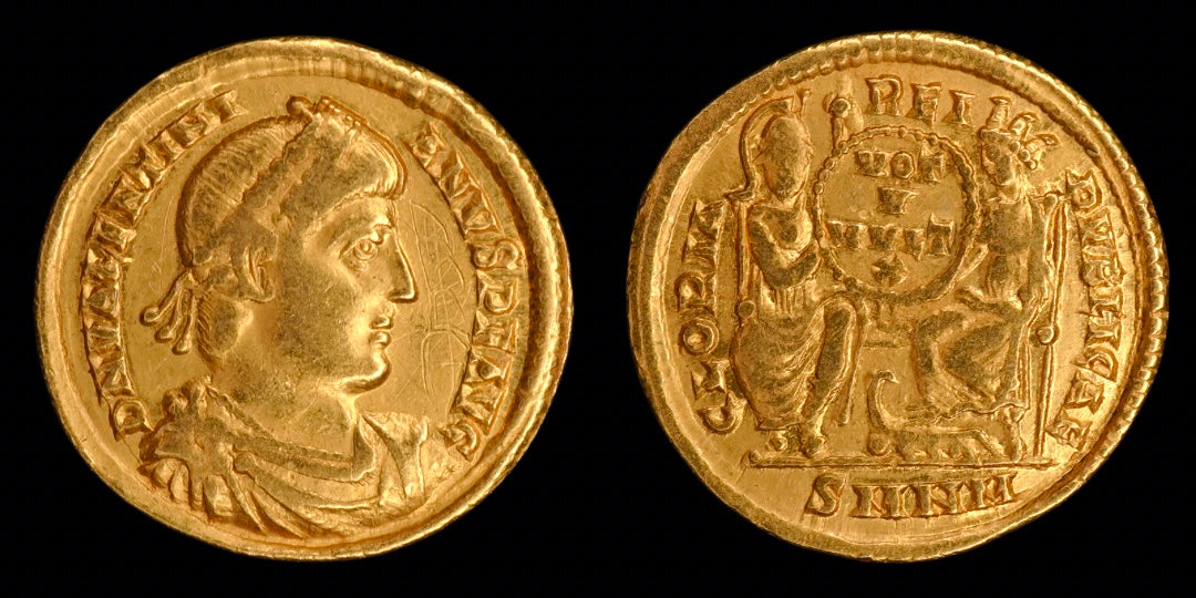 العملة: سوليدوس ذهبي للإمبراطور فالنتينيان الأول، تم سكه في نيقوميديا (٣٦٧-٣٧٥م).