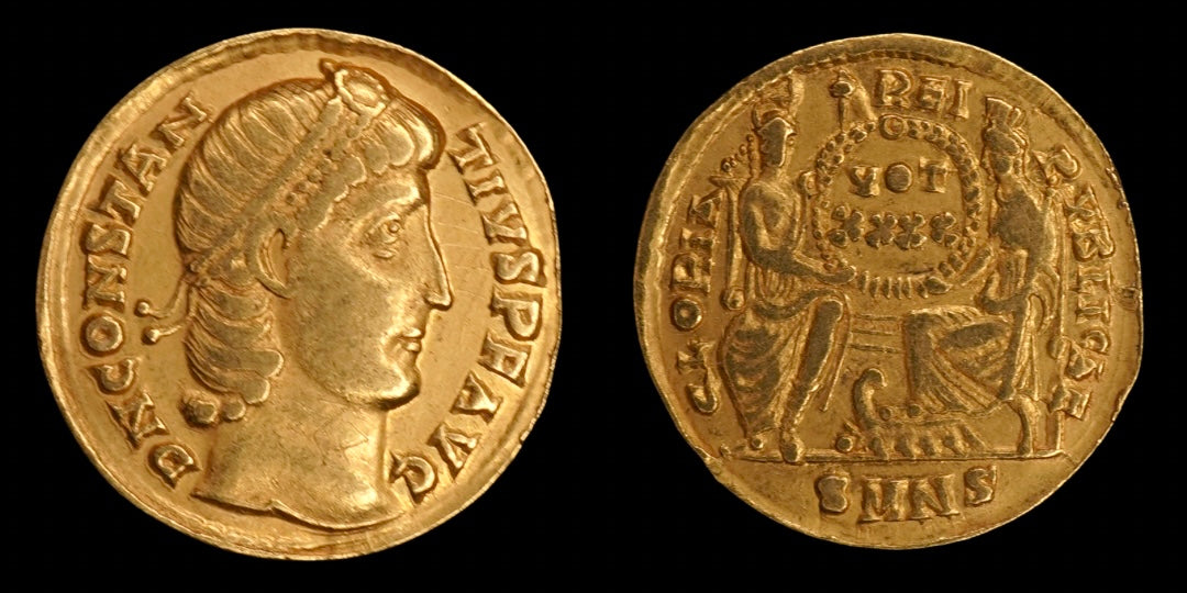 العملة: سوليدوس ذهبي للإمبراطور قسطنطيوس الثاني، تم سكه في نيقوميديا (٣٥٥-٣٦١م).