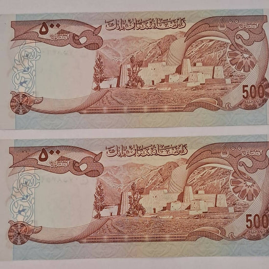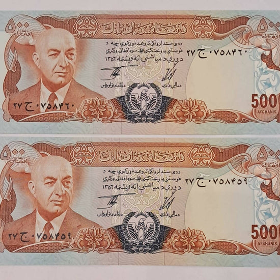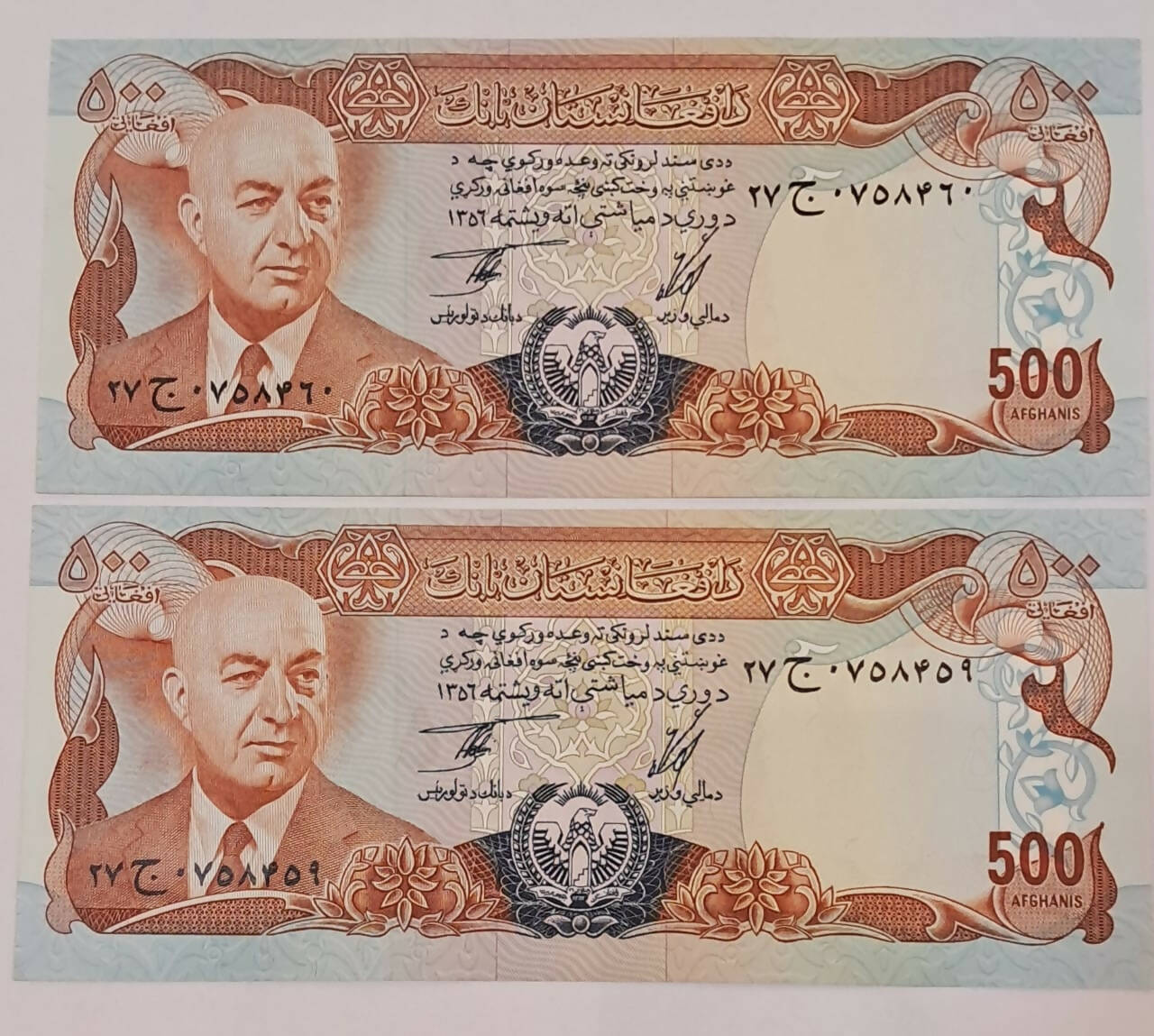 500 Afghanis, Afghanistan ,1977, UNC -consecutive 2 notes