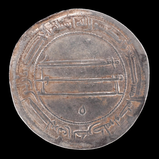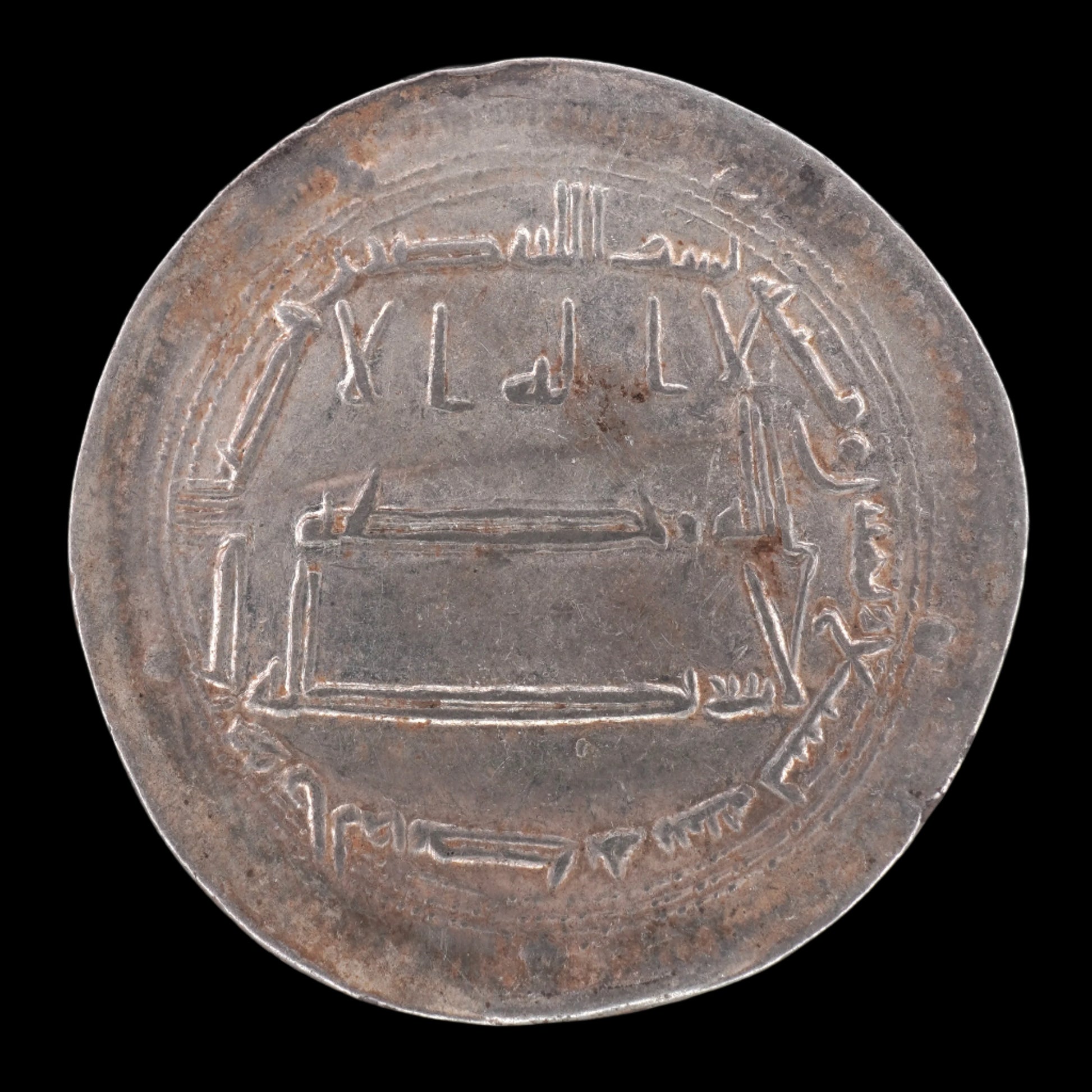 A silver dirham struck in Al-Muhammadiyah during the reign of Harun Al-Rashid, in good condition with some circulation marks.