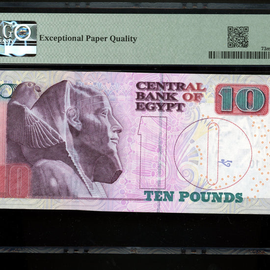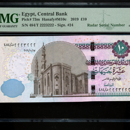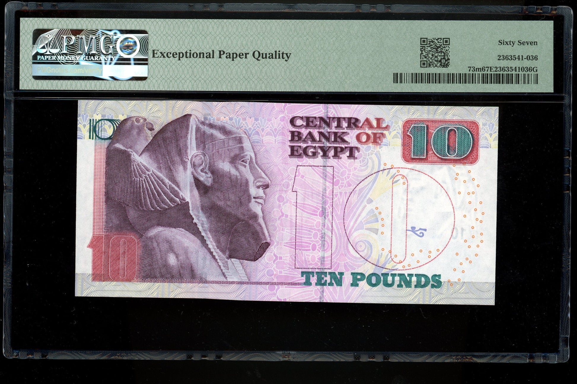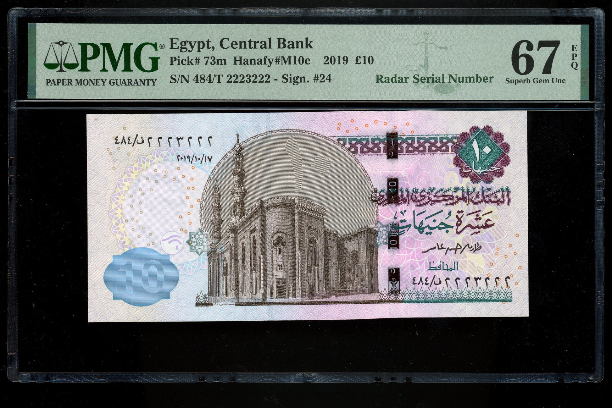 A 2019 Egypt 10 Pounds banknote with radar serial number, Pick 73m, graded PMG 67 EPQ. Bright paper and sharp presentation.
