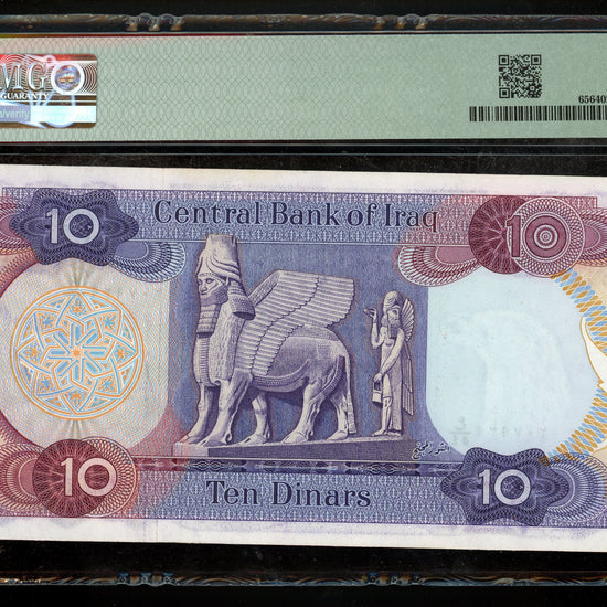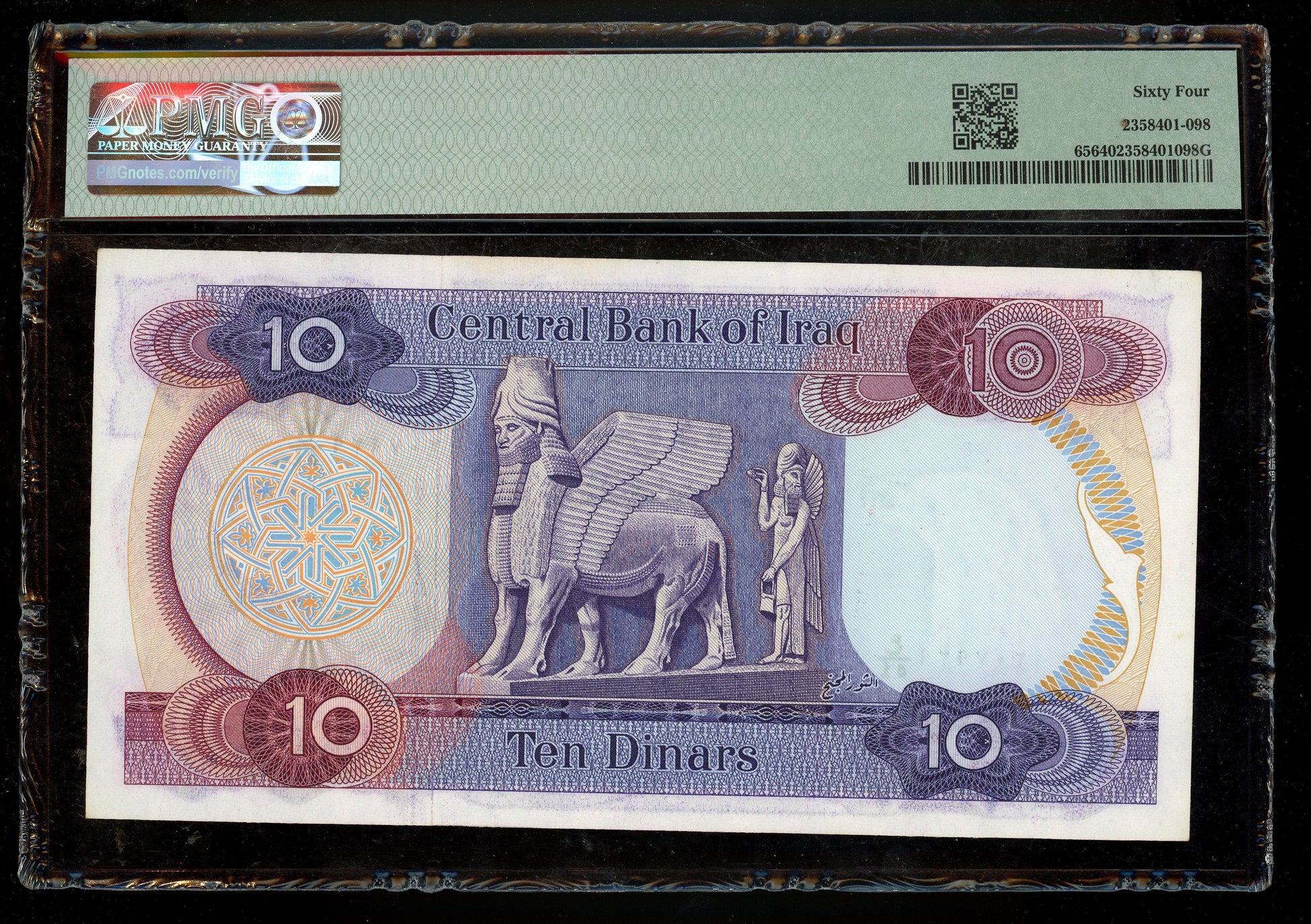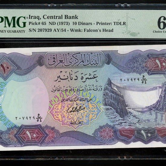 ورقة عراقية من فئة 10 دنانير، بدون تاريخ (1973)، برقم كاتالوج 65 وتقييم PMG 64. تصميم ملون وبحالة جيدة.