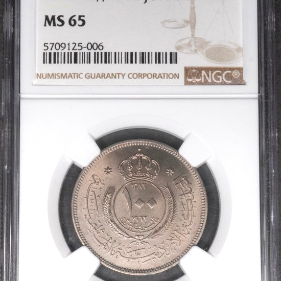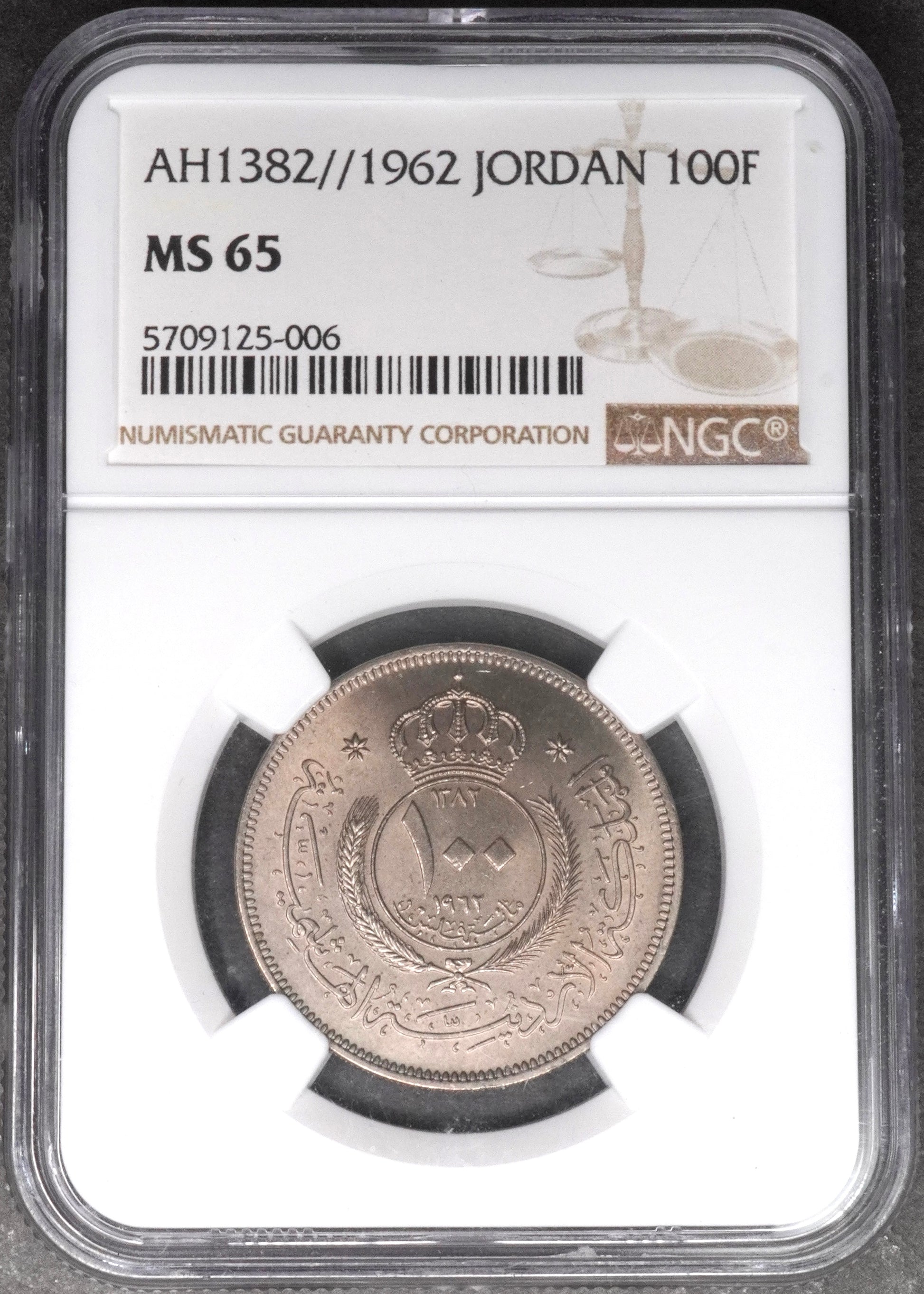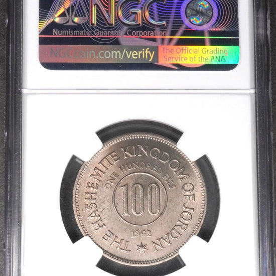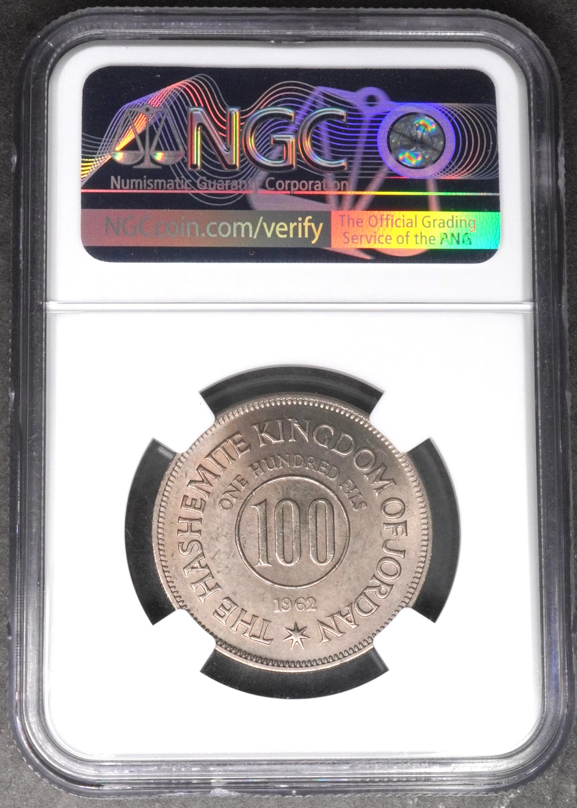A 1962 Jordan 100 Fils coin graded NGC MS 65. Strong strike with clean surfaces.