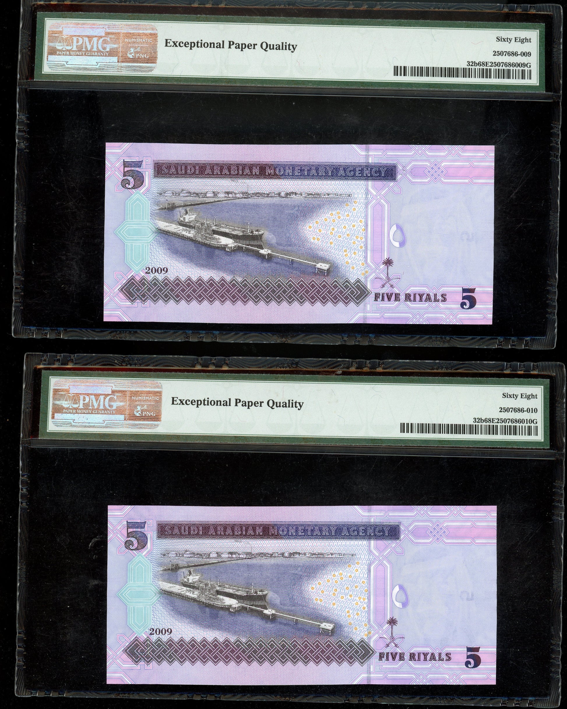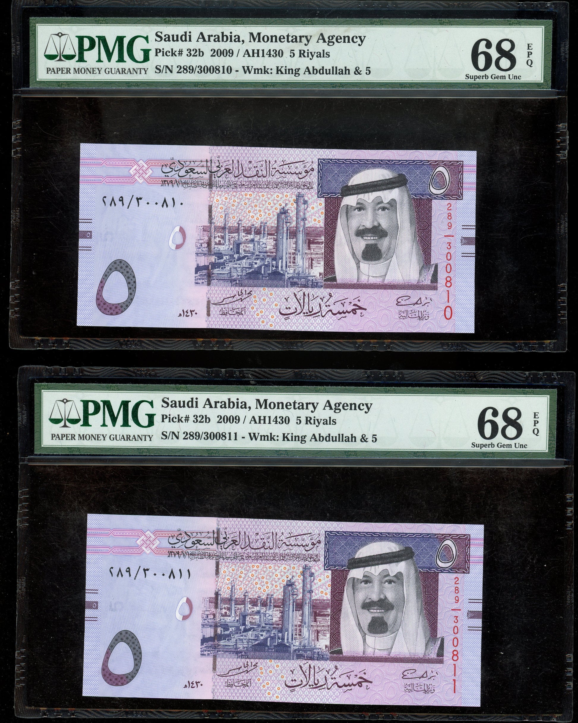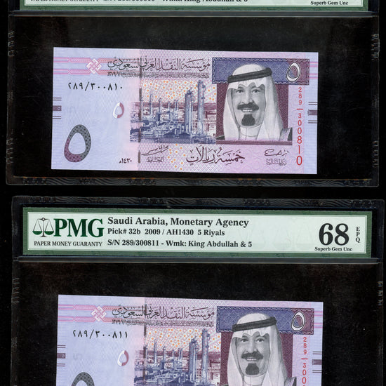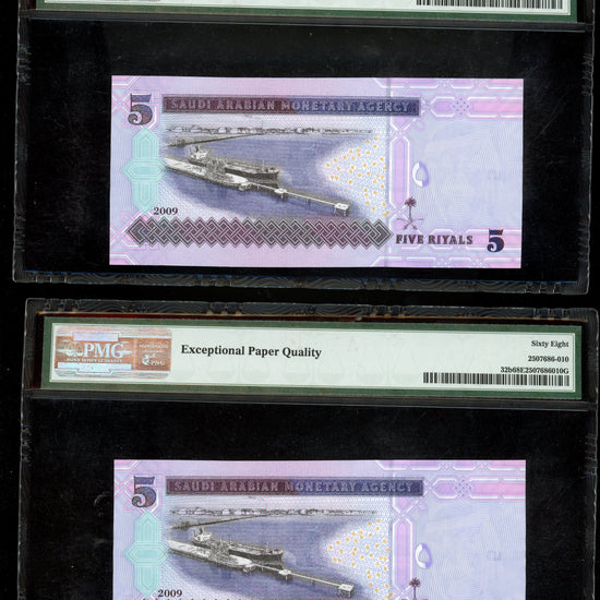 Lot 939: Saudi Arabia - 2009 - 5 Riyals - 2 Consecutive Notes - PMG 68 EPQ - SECOND HIGHEST GRADE